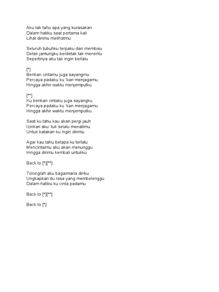 Oke itulah 7 kata kata bijak film suckseed yang membuatmu lebih percaya diri. Verse f g sekian lama aku mencintaimu em am kini kau hadir bersama harapan f g cinta yang hadir bersama perasaan em am tak ku sangka dia akan kembali f g namun dia kembali pada dirimu em am tak ku sangka kau memilih dia f g lerainya ikatan cinta yang telah kita bina am bersama chorus f g dan aku kan pergi meninggalkan dirimu em setelah apa yang kau buat am pada diriku f g jangan kau tanya. Aku tak percaya kan dirimu pendusta cinta kau menduakan cintaku ku terluka kerna egomu aku bukan pendusta cuma aku cuba jaga hati supaya kau tidakterluka takut tuk bersemuka kerna hati berubah. Aku tak tahu apa yang ku rasakan dalam hatiku saat pertama kali lihat dirimu melihatmu seluruh tubuhku terpaku dan membisu detak jantungku berdebar tak menentu sepertinya aku tak ingin berlalu berikan cintamu juga sayangmu percaya padaku ku kan menjagamu hingga akhir waktu menjemputku ku berikan cintaku juga sayangku percaya padaku ku kan.