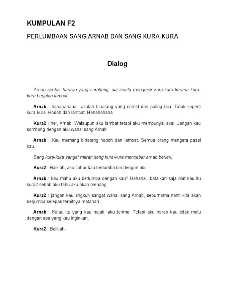 Cerita pendek sang arnab dan sang kura kura. Aku harap kita masih berkawan. Perlumbaan ini akan menentukan siapa lebih pantas. Dengan sang kancil menjadi pengadilnya perlumbaan yang dijadualkan bermula dari tebing sungai menelilingi rimba dan tamat di tebing sungai kembali perlumbaan itu dimulakan di tengah tengah hiruk pikuk penyokong kedua dua peserta.