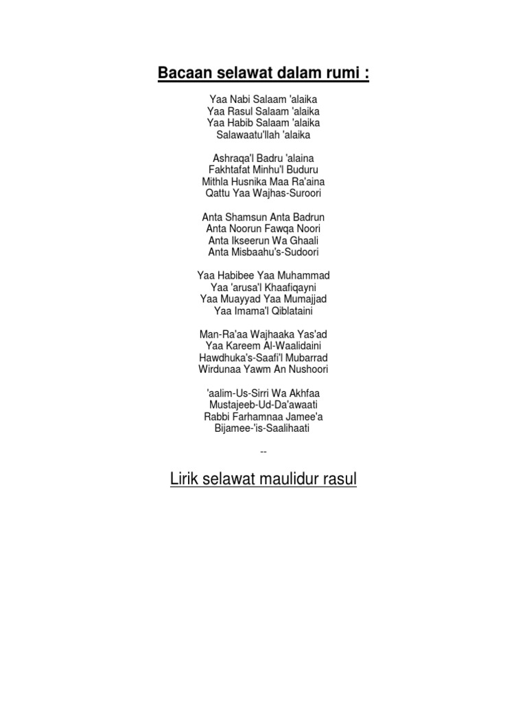 Bacaan selawat ke atas nabi rumi. Segala penghormatan yang berkat solat yang baik adalah untuk allah. Lafaz bacaan selawat yang paling ringkas yang sesuai dengan dalil dalil yang sahih adalah. Selain al qur an rasulullah juga banyak menerangkan tentang sholawat di dalam haditsnya seperti hadits berikut. Bacaan selawat nabi lengkap dalam jawi rumi beserta terjemahannya.