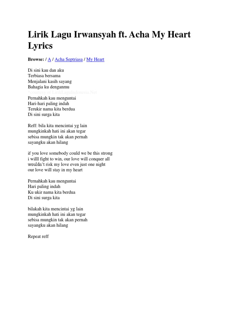 Bila kita mencintai yang lain. Salahkah kita bila kita jatuh cinta pada orang yang sudah mencintai orang lain. Tribunsolo com chord kunci gitar dan lirik lagu my heart acha ft irwansyah. Disini kau dan aku terbiasa bersama menjalani kasih sayang. Bila cinta itu memudar lalu kamu mencari sosok lain yang menawarkan kehangatan seperti dulu maka apa lantas kamu menikah lagi.