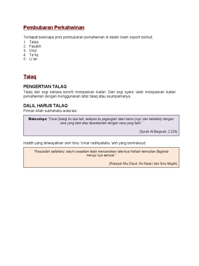 Cara pembubaran perkahwinan dalam islam. Pembubaran perkahwinan dalam islam in prosiding seminar tamadun 2012 at marbawy hall faculty of islamic civilization universiti teknologi malaysia on 21 april 2012 pp. Talak perceraian yang dilakukan oleh suami dengan lafaz talak satu dua atau tiga sama ada secara nyata atau kiasan. Manakala dalam enakmen undang undang keluarga islam negeri melaka 2002 seksyen 53 menegaskan lagi sebab sebab yang menyebabkan berlakunya fasakh seperti di bawah ini. Dalam agama islam juga memberikan wanita hak untuk membubarkan sesebuah perkahwinan bagi mempertahankan hak hak mereka dan ia mempunyai beberapa cara untuk mereka membubarkan sesebuah perkahwinan mereka.