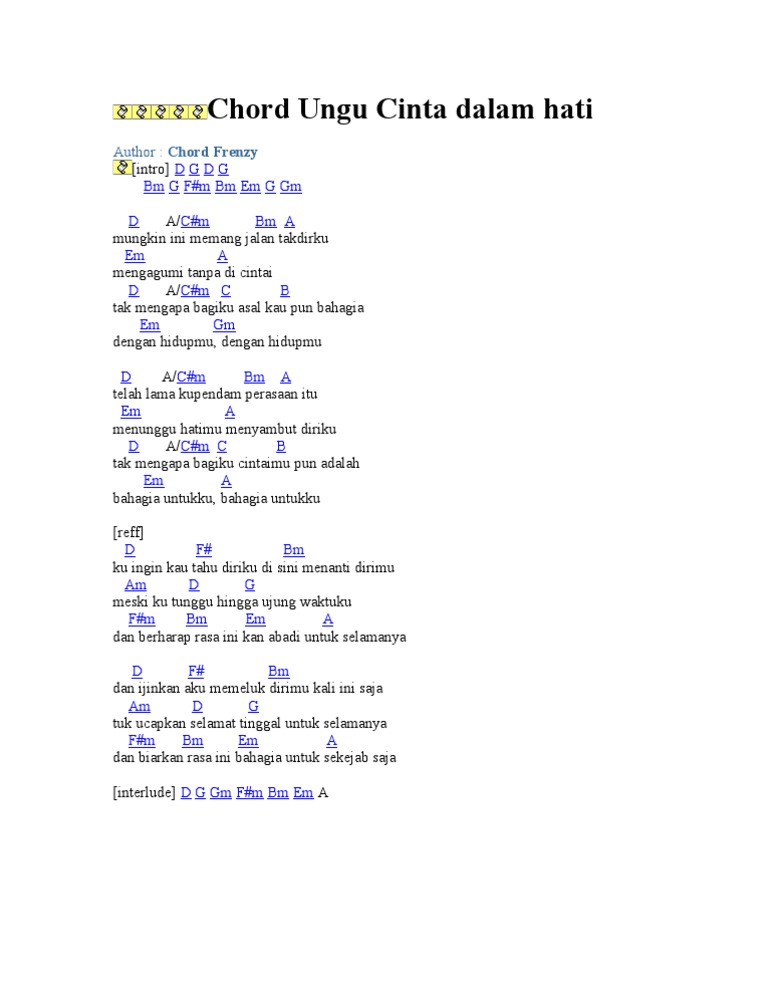Berikut cuplikan syair nyanyian teks lagunya tak mengapa bagiku cintaimu pun adalah bahagia untukku bahagia untukku reff. Lagu luka disini masuk dalam albun bertajuk penguasa hati yang dirilis pada 2009 silam. G c g c em c bm em am c cm g d em d mungkin ini memang jalan takdirku am d mengagumi tanpa dicintai g bm e em tak mengapa bagiku asal kaupun bahagia am cm dengan hidupmu. Chord ungu cinta dalam hati capo di fret 2 intro.