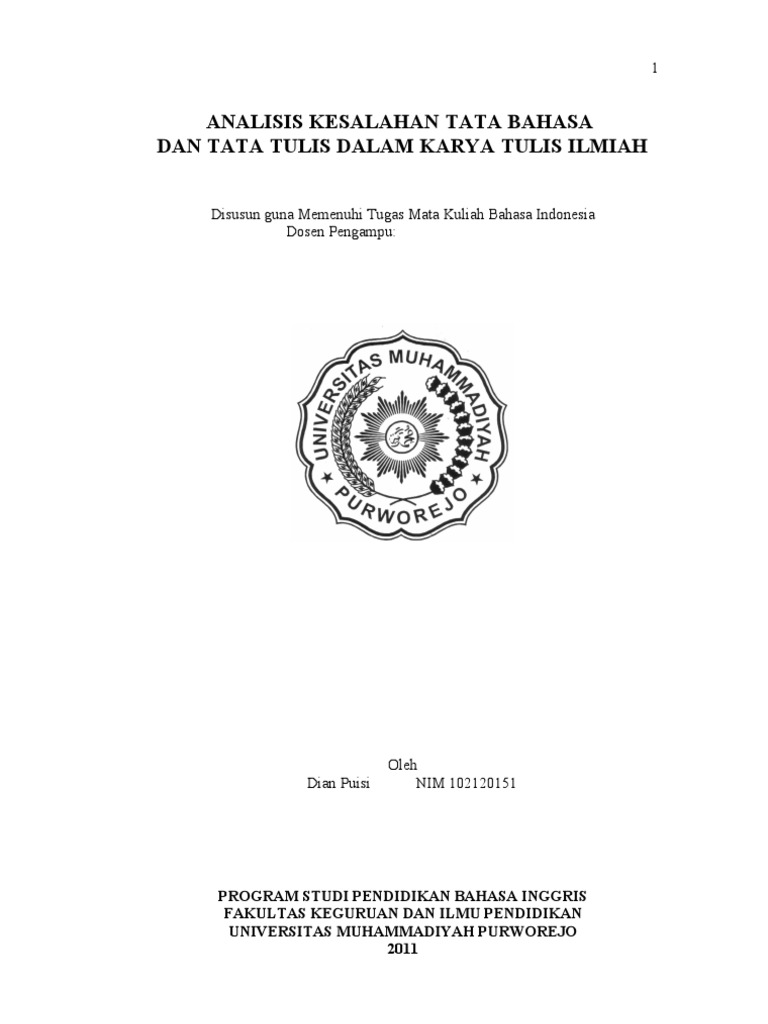 Dalam penyusunan karya ilmiah ini kami telah berusaha semaksimal mungkin pantas dengan kemampuankami. Kesalahan dalam penulisan kaya tulis ilmiah. Bagian perkuliahan dasar umum universitas. Program studi pendidikan bahasa inggris fakultas keguruan dan ilmu pendidikan universitas muhammadiyah purworejo 2011.