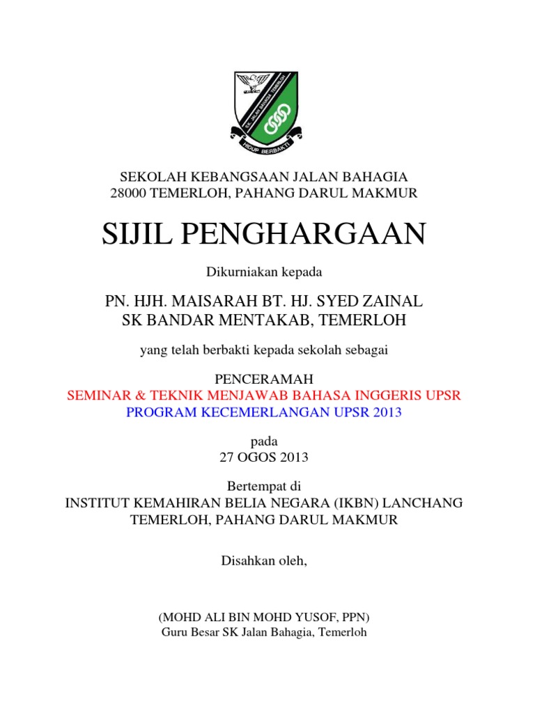 Use the download button below or simple online reader. Sijil terjemahan dalam kamus bahasa melayu inggeris di glosbe kamus online free. Tujuan dari menulis surat menerima penghargaan ini adalah untuk menunjukkan penghormatan dan apresiasi kepada lembaga atau organisasi yang telah memberikan penghargaan kepada kita karena prestasi kontribusi atau pengorbanan yang telah kita lakukan untuk lingkungan atau tempat kita bekerja. Dalam family gathering biasanya diumumkan juga siapa karyawan teladan.