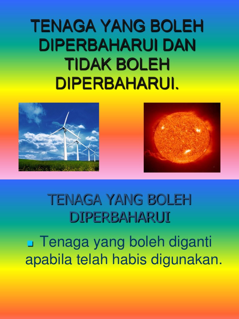Iteach sains tingkatan 1 sumber tenaga yang boleh diperbaharui dan tidak boleh diperbaharui topik 6 sumber sumber tenaga sumber tenaga boleh diperbaharui geoterma tenaga elektrik ombak tenaga keupayaan tenaga kinetik matahari tenaga solar tenaga haba angin tenaga angin biojisim air tenaga hidroelektrik 14. Sumber sumber tenaga yang boleh diperbaharui boleh diganti secara semula jadi dalam jangka masa yang singkat. Sumber tenaga ini akan kekal selamanya walaupun kita berterusan menggunakannya. Sumber tenaga ini akan kekal selamanya walaupun kita berterusan menggunakannya.