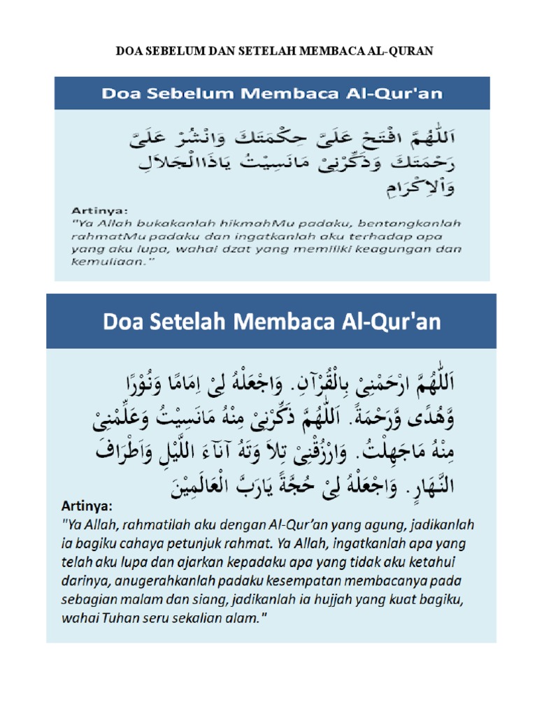Doa sebelum dan sesudah baca al quran. Al qur an yang dibaca tidak sekadar menjadi bacaan tapi memberikan efek dahsyat pahala yang amat besar. Doa doa islam doa sebelum dan sesudah membaca al quran serta keutamaan membaca al quran di bulan ramadan ini bagi setiap muslim adalah momen yang baik untuk semakin mendekatkan diri kepada allah. Hendaklah seseorang muslim memperhatikan adab adab dan syarat syarat dalam berdoa yang merupakan sebab ditunaikan doa. Sesudah membaca quran pula kita mohon dan berdoa lagi ke hadrat allah taala.