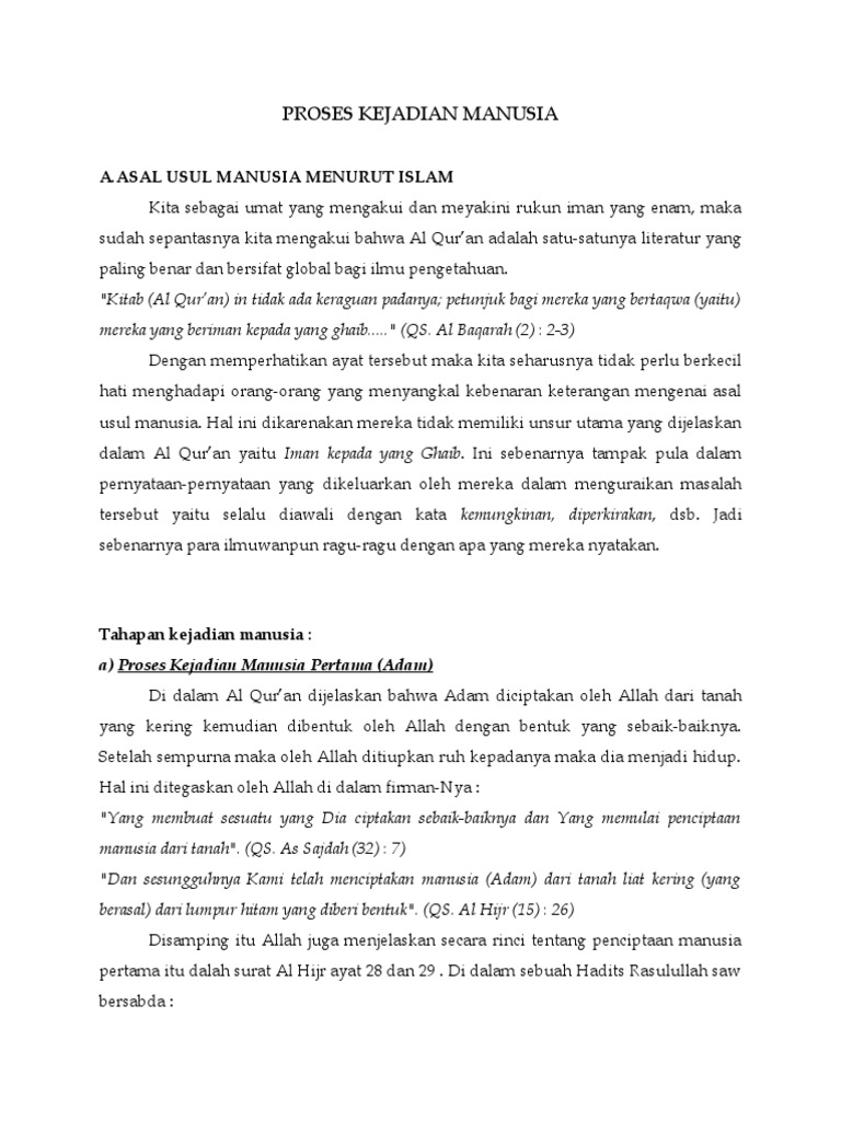 Kejadian manusia ketiga adalah kejadian semua keturunan adam dan hawa kecuali nabi isa a s. Asal usul manusia menurut pandangan agama islam sangat bertentangan dengan apa yang telah dikemukakan oleh para pencetus dan pendukung teori evolusi. Baca cara meningkatkan akhlak terpuji hakikat manusia menurut pandangan islam. Manusia diberi akal dan hati sehingga dapat memahami ilmu yang diturunkan allah berupa al quran menurut sunah rasul.