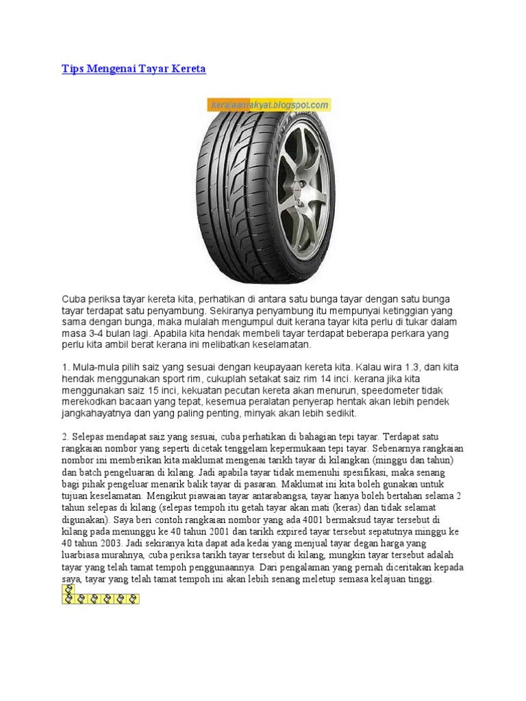 Jangka hayat tayar kereta. Jika anda penggemar drift maka sememangnya jangka hayat tayar kereta anda adalah sangat pendek. Jangka hayat tayar adalah sebagai tanda amaran tayar kereta anda harus diganti dengan tayar yang baru. Hal penyenggaraan tayar dan kenderaan pula sangat kritikal bagi jangka hayat tayar. Tetapi jangka hayat tayar kereta boleh tahan lama bergantung kepada beberapa faktor seperti berikut.