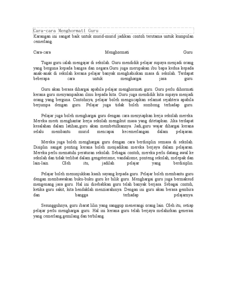Karangan cara cara menghargai jasa pemimpin negara. Memetik kata kata daripada mantan menteri pelajaran datuk seri hishamuddin hussein yang menyatakan bahawa pemupukan adab menghormati guru bermula dari rumah dan mengharapkan ibu bapa menggalakkan anak anak mereka menghargai jasa guru. Oleh itu cara cara menghargai jasa guru yang mewarnai fokus perbincangan akan dihuraikan dan dipericikan untuk kepentingan bersama. Cara untuk menghargai negarawan adalah dengan pembinaan muzium negarawan. Dengan semangat kegigihan dan keberanian yang ditunjukkan oleh beliau saya juga sedia berkorban untuk bangsa dan negara up2 supaya kedaulatan negara dapat dipertahankan.