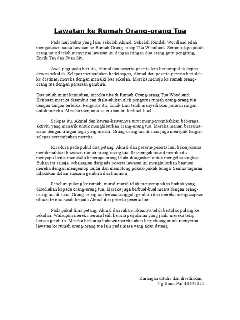 Karangan lawatan ke rumah orang tua. Seperti yang diketahui kemahiran sosial dan kebertanggungjawaban adalah amat penting dan perlu diterapkan dalam diri setiap remaja bermula dari usia yang muda. Gilbert low share to. Contoh laporan melawat ke rumah orang tua contoh karangan laporan tahun 4 contoh karangan laporan kebakaran hotel contoh karangan ucapan. Related posts to contoh karangan laporan melawat ke rumah orang tua.