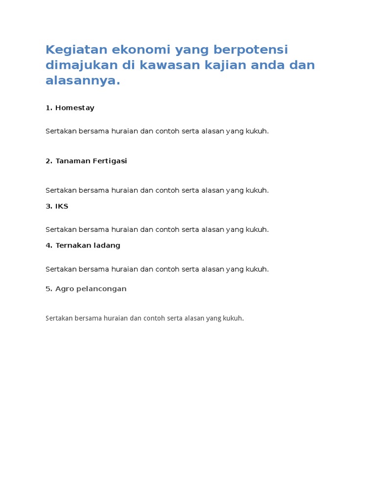 Kegiatan ekonomi yang berpotensi dimajukan di kawasan kajian. 106920 hits kegiatan ekonomi yang berpotensi dimajukan di kawasan anda kegiatan ekonomi geografi pt3 2015 calon pt3 geografi 2015 dikehendaki memenuhi kajian lapangan dengan memberikan pendapat secara kreatif dan kritis serta rasional mengenai potensi. Huraian faktor kegiatan ekonomi yang berpotensi dimajukan. 3 rujukan saya telah menggunakan pelbagai bahan rujukan untuk saya mencari maklumat tentang kegiatan ekonomi di kawasan kajian. Contoh contoh kegiatan ekonomi di sekitar kawasan petempatan.
