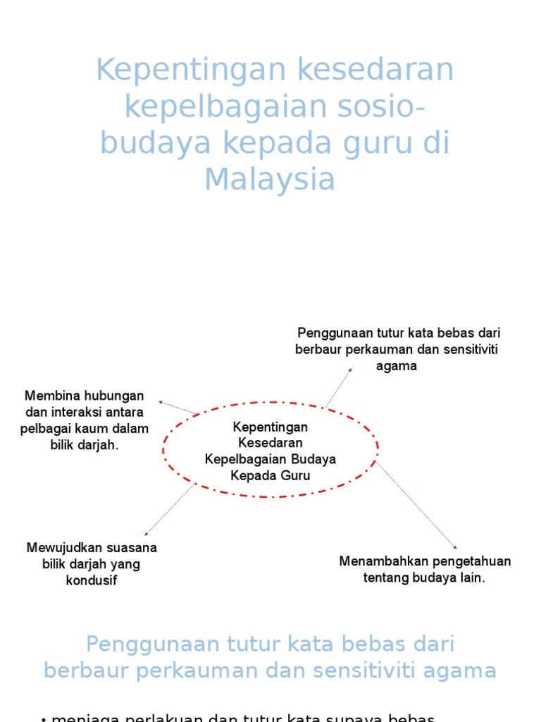 Kepentingan kepelbagaian kaum di malaysia. Malah unsur kepelbagaian itu dinyatakan di dalam kitab suci al quran melalui surah al hujraat ayat 13 yang menyatakan penciptaan manusia dalam pelbagai bangsa dan suku bertujuan supaya mereka. Lebih daripada 50 jumlah penduduk. Kaum kaum utama seperti melayu cina india kadazan iban dan sebagainya dapat hidup dalam keadaan harmoni. Malaysia merupakan salah satu negara berbilang kaum yang dapat hidup dengan harmoni.