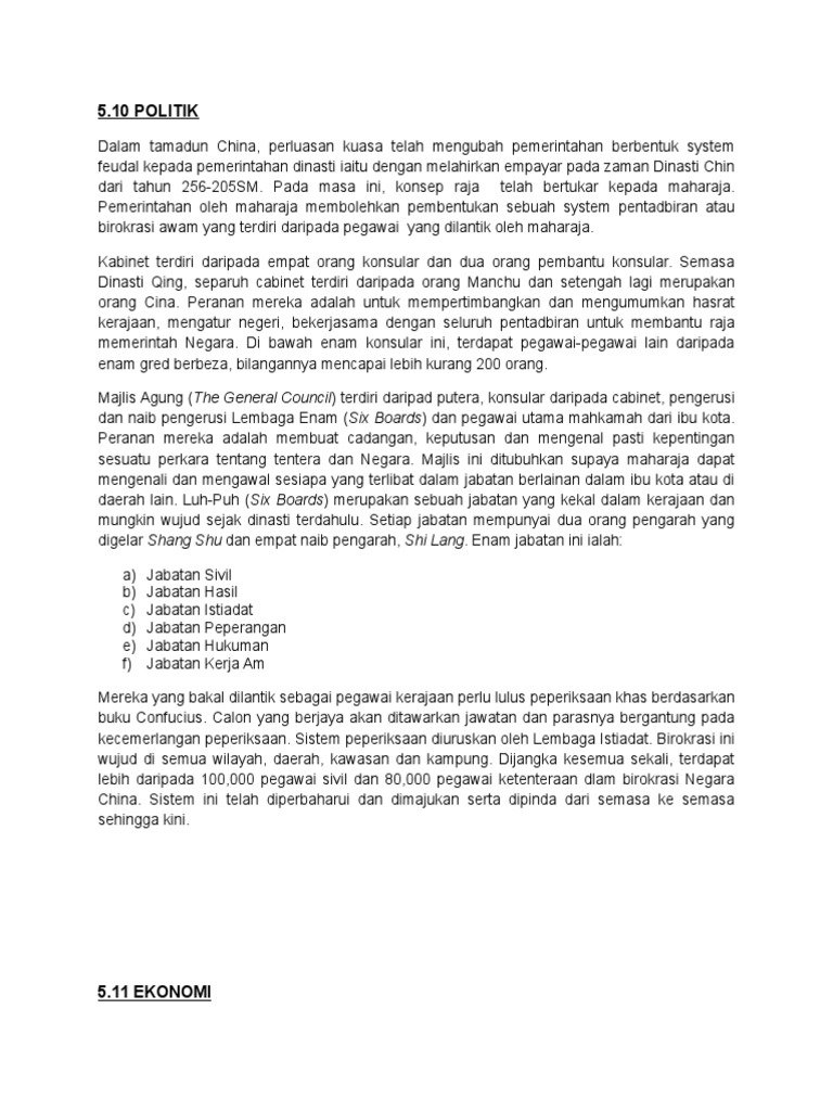 Amalan pengkhususan kerja dan kepentingan tulisan 1 badan kehakiman 1 badan perundangan 1 bahasa sanskrit 1. Selain itu tamadun china juga merupakan tempat kemunculan ajaran utama di dunia iaitu confucianisme dan taoisme. Hsiu tai tahap pertama selaras dengan ijazah pertama tahap kedua chun jen setaraf dengan sarjana dan chin shih setaraf dengan doctor falsafah seperti yang terdapat pada zaman moden ini.