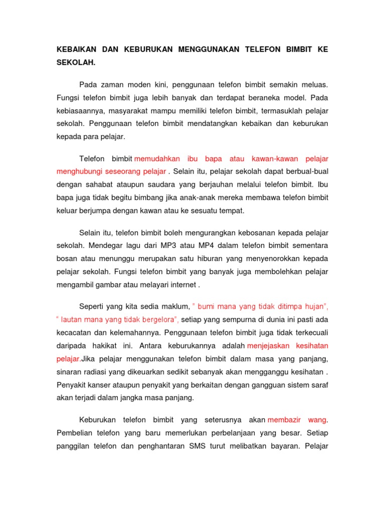 Pelajar selalu menatap telefon bimbit mereka dan hal ini mengurangkan komunikasi antara satu sama lain. Malah ada ibu bapa yang berkemampuan menyediakan telefon bimbit untuk kegunaan anak anak. Karangan kewajaran penggunaan telefon bimbit di sekolah teknologi yang canggih telah membantu manusia untuk melaksanakan pelbagai urusan dan menjadikan negara kita semakin maju. Pelajar boleh mengambil isi isi penting sebagai idea bagi membuat penulisan karangan masing masing berpandukan contoh di bawah.