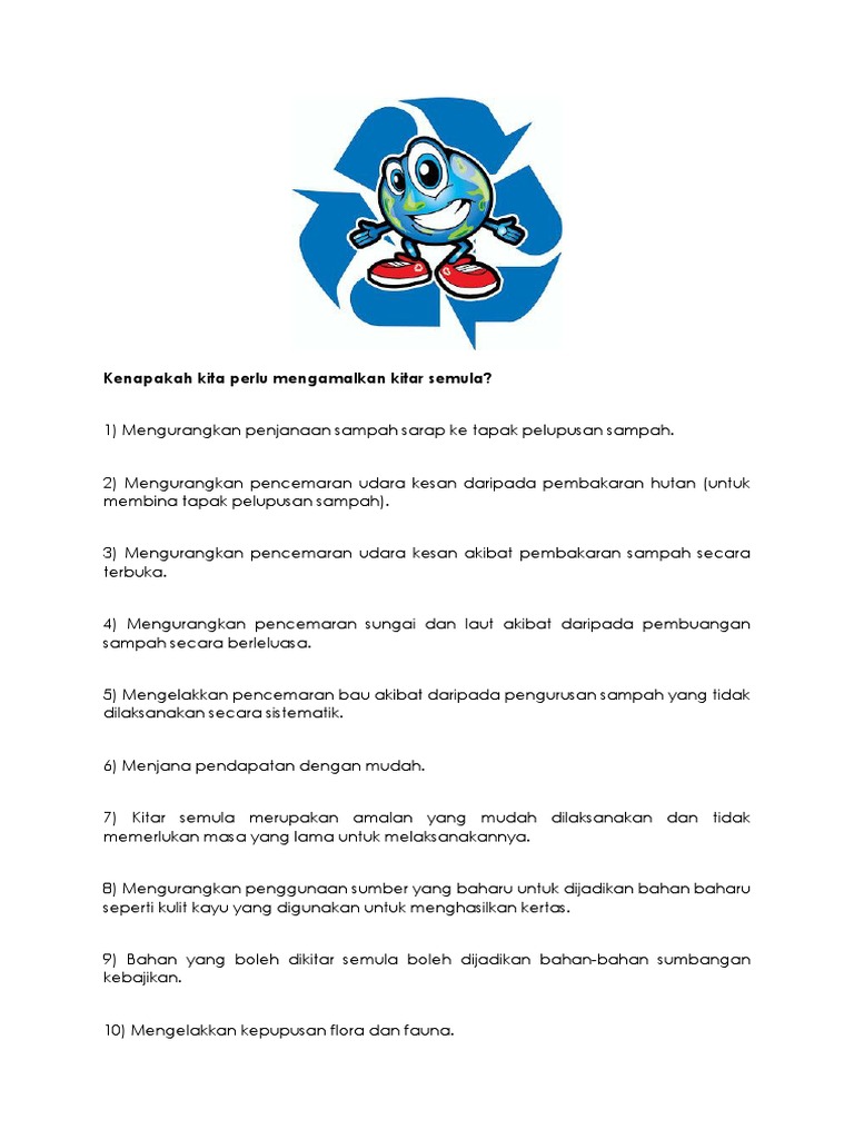Secara tidak langsung juga peserta akan belajar untuk berjimat cermat. Kegagalan kitar semula impak kepada alam sekitar. It is the responsibility of each user to comply with 3rd party copyright laws. Haliza abdul rahman berkata pada tahun 2018 rakyat malaysia membuang sumber kitar semula bernilai rm476 juta.