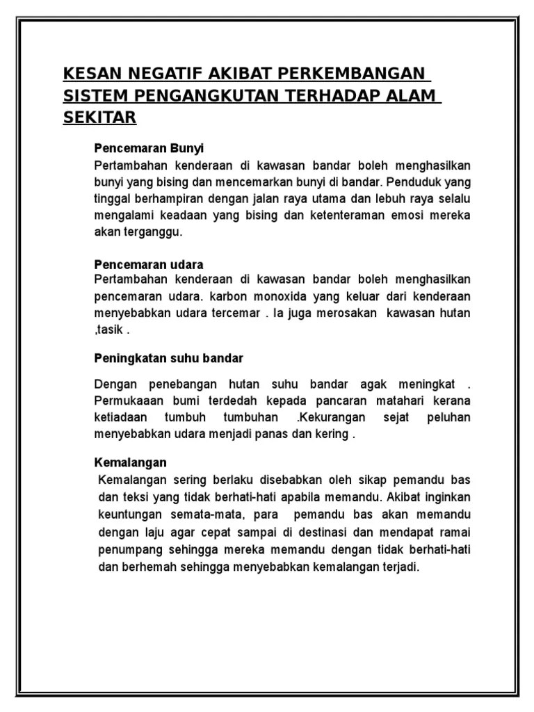 Akhir akhir ini aspek ini dibincangkan secara bersungguh sungguh apabila paras bunyi semakin meningkat dari hari ke hari. Pencemaran alam sekitar dapat dikategorikan dan disenaraikan kepada pelbagai bentuk iaitu pencemaran bunyi pencemaran air pencemaran udara pencemaran tanah pencemaran haba dan pencemaran laut. Kajian pada tahun 2005 oleh penyelidik dari sepanyol telah mendapati bahawa penghuni di sekitar kawasan bandar sanggup untuk membayar sekitar empat euro pada setiap desibel dalam tempoh setahun bagi mengurangkan bunyi. Di antara kesan utama yang menimpa manusia akibat daripada pencemaran alam sekitar ialah terhadap udara suhu persekitaran dan.