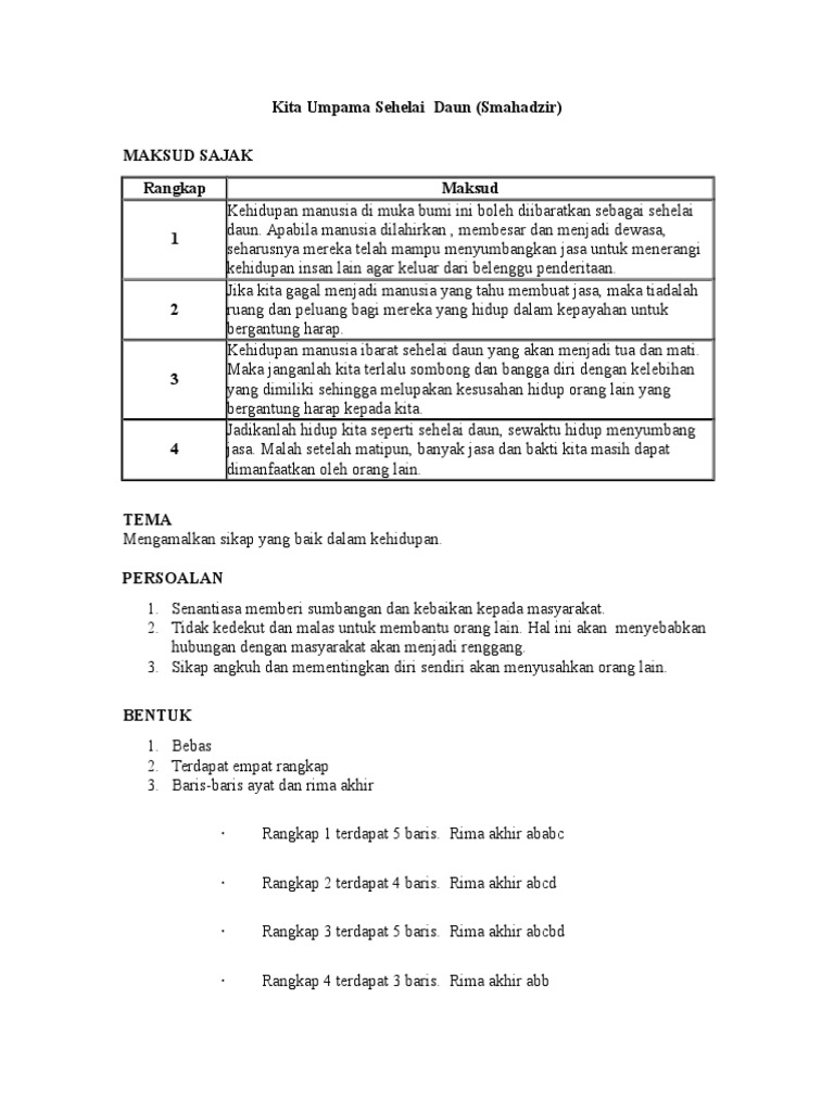 Sajak kita umpama sehelai daun k. Maksud rangkap persoalan gaya bahasa unsur bunyi bentuk nilai dan pengajaran maksud rangkap 1 kehidupan manusia di muka bumi ini boleh diibaratkan sebagai sehelai daun. Komsas tingkatan 1 sila share kepada kawan kawan dengan menekan butang di bawah maksud sajak tema persoalan bentuk gaya bahasa nilai pengajaran k1. Lalu melebar dan merimbun.