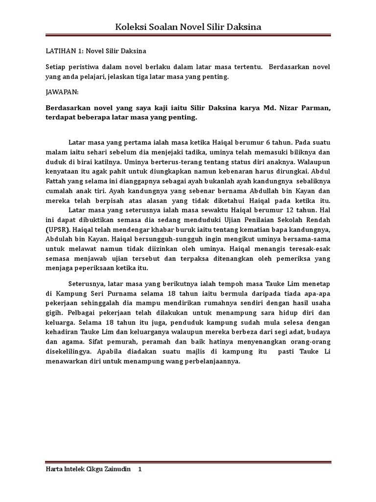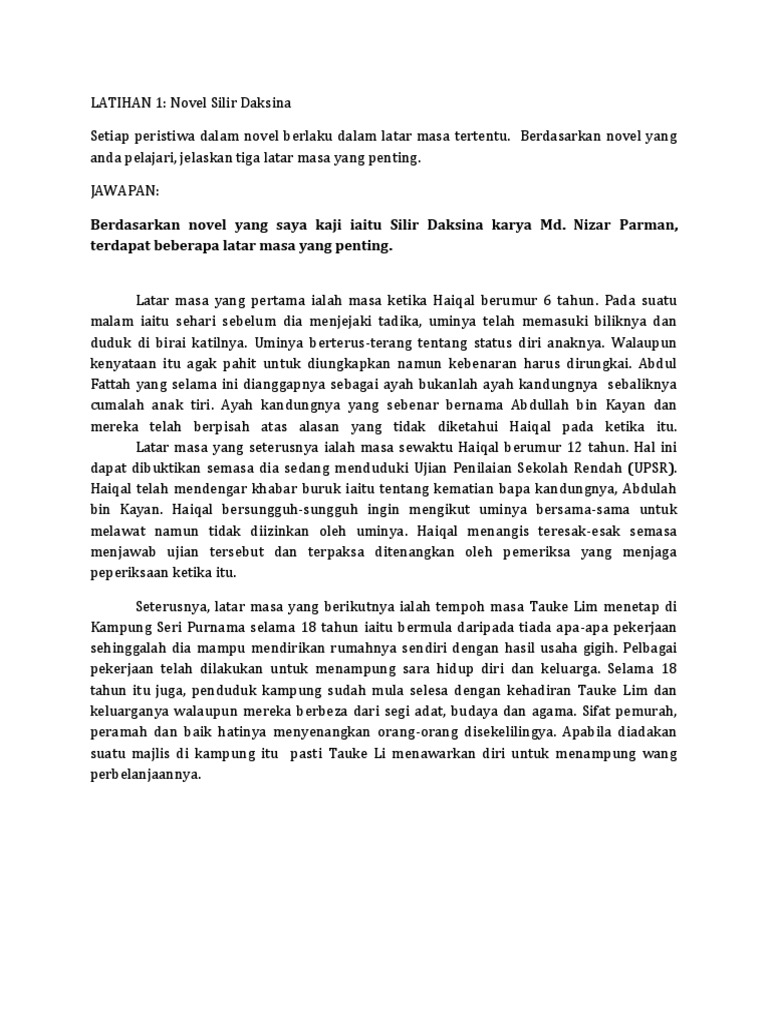 Tempat tinggal haiqal bersama sama dengan umi walid dan adik tirinya iaitu nurul asiah di kuala lumpur. Sinopsis haiqal berbekalkan sebuah manuskrip lama yang diterima daripada seorang gadis berbangsa cina yang tidak dikenalinya telah pergi ke kampung halaman ayahnya abdullah kayan. Berdasarkan sebuah novel yang anda kaji huraikan peristiwa yang menunjukkan nilai ketabahan watak utama. Analisis latar novel silir daksina tingkatan 5.