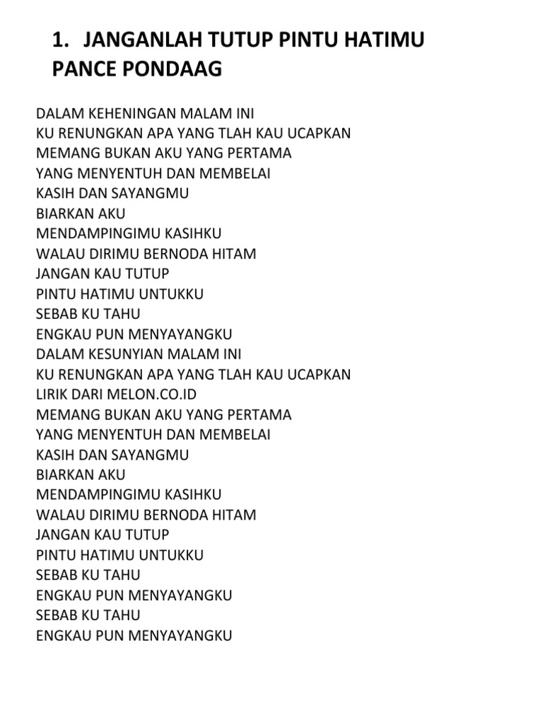 Lirik lagu bukan yang pertama pance. Dapatkan lirik lagu lain oleh pance f. Pastikan anda sudah melihat video musiknya. Pondaag lirik lagu becak solo langgam lirik lagu sekeras batu dhyo haw lirik lagu di batas masa siti nurhaliza lirik lagu pasrah nassier wahab lirik lagu mendung ra udan safira inema lirik lagu kesempatan oddie agam feat dewi yull lirik lagu heboh jangger siti badriah. Enjoy the videos and music you love upload original content and share it all with friends family and the world on youtube.