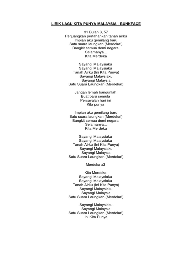 Lirik lagu kita punya malaysia bunkface. 31 bulan 8 57. 31 bulan 8 57 perjuangkan pertahankan tanah airku impian aku gemilang baru satu suara laungkan merdeka bangkit semua demi negara selamanya kita merdeka. Kita punya malaysia nyanyian. Kita punya malaysia nyanyian.
