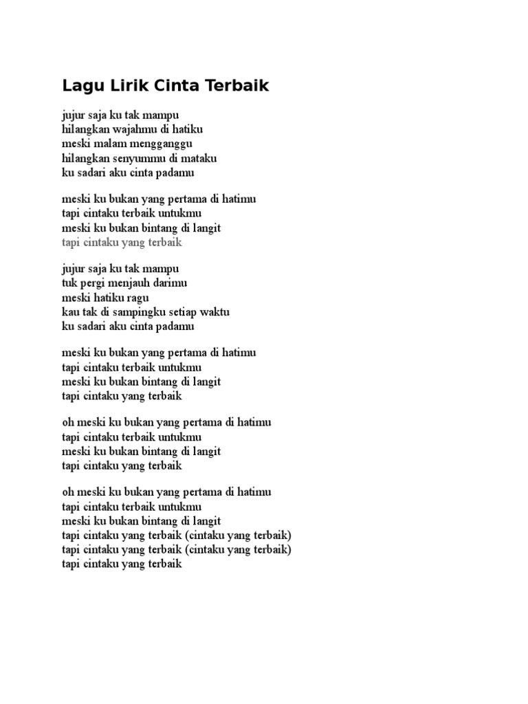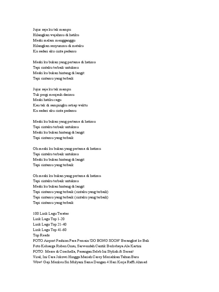 Lirik lagu meski ku bukan yang pertama dihatimu tapi cintaku terbaik. Lirik lagu cinta terbaik cassandra. F g em meski ku bukan yang pertama a dm g c dihatimu tapi cintaku terbaik untukmu f g em am meski ku bukan bintang di langit dm g c g tapi cintaku yang terbaik ouu. Berikut cuplikan syair nyanyian teks lagunya hilangkan senyummu di mataku ku sadari aku cinta padamu meski ku bukan yang pertama di hatimu meski ku bukan bintang di langit tapi cintaku yang terbaik jujur. Tribunsumsel com palembang download unduh lagu cinta terbaik cassandra meski ku bukan yang pertama di hatimu tapi cintaku.
