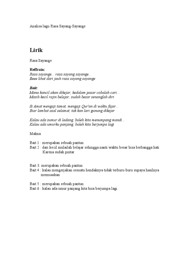 Lagu tersebut sering dinyanyikan secara turun temurun sejak dahulu untuk mengungkapkan rasa sayang masyarakat maluku terhadap lingkungan dan sosialiasi di antara mereka. Kulihat dari jauh rasa sayang sayange lagu ini merupakan jenis lagu pantun berbalas jadi silahkan teman teman bernyanyi dengan pantun hasil kreasi sendiri mengikuti nada lagu di klip berikut ini. Rasa sayange rasa sayang sayange eeee lihat dari jauh rasa sayang sayange mana kancil akan dikejar kedalam pasar cobalah cari masih kecil rajin belajar sudah besar senanglah diri si amat mengaji tamat mengaji qur an di waktu fajar biar lambat asal selamat tak kan lari gunung dikejar informasi lagu rasa sayange. It is a folk song for kepulauan nusantara malay archipelago.