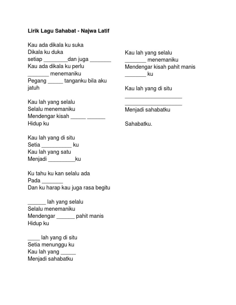 Kau ada di kalaku suka di kalaku duka setiap tangisan dan juga ketawa kau ada di kalaku perlu setia menemaniku pegang erat tanganku bila aku. Lirik lagu sahabat najwa latif feat syam kamarul sleeq najwa latif kau ada di kala ku suka di kala ku duka setiap tangisan dan juga ketawa kau ada di kala ku perlu setia menemaniku pegang erat tanganku bila aku jatuh. C em f g c em kau ada dikala ku suka f dikala ku duka g setiap tangisan dan juga ketawa c em kau ada dikala ku perlu f setia menemaniku g pegang erat tanganku bila ku jatuh c kau lah yang selalu em slalu menemaniku f g mendengar kisah pahit manis hidupku c kau lah yang disitu em setia menungguku f kaulah yang satu g menjadi sahabatku c em f. Lirik lagu sahabat najwa latif friday march 15 2013.
