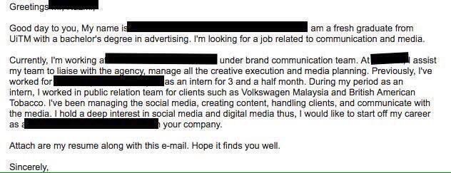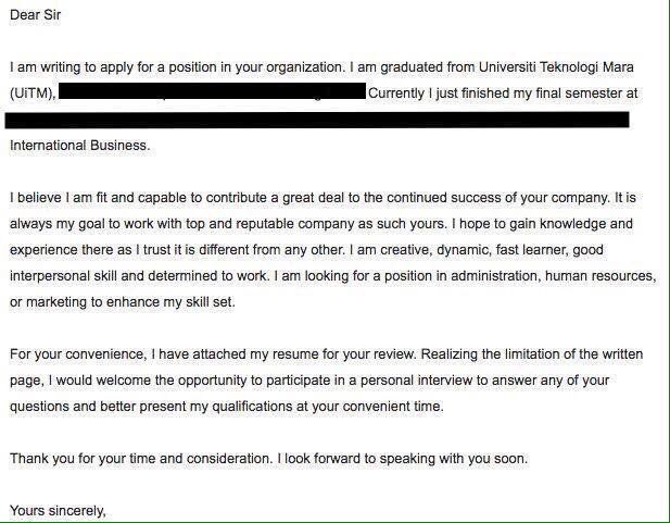 Kelebihan faks dan email sebagai medium penghantaran resume dan surat mohon kerja. Contoh permohonan kerja melalui email yang power seorang oil and gas junkie serta bakal graduan mba dari brunel business school ameirul azraie telah berkongsi pengalamannya mencari kerja di dalam industri minyak dan gas yang kita semua sedia maklum amat sukar untuk ditembusi. Sama macam masalah no 1 hanya send resume tanpa sebarang ayat. Mohon dengan tertib dan ikut panduan yang telah diajar ya.