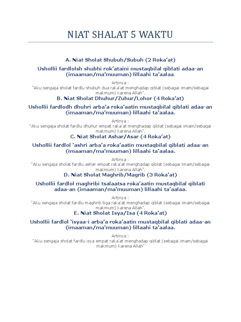 Niat dalam solat fardhu seperti solat subuh zohor asar maghrib isyak dan asar niat sembahyang lima waktu ini wajib dilakukan setiap individu yang bergelar muslim. Solat fardhu wajib dikerjakan oleh orang islam diantaranya kepada mereka yang telah akil baligh berakal suci dari haid dan nifas serta syarat wajib lain yang boleh dirujuk di al azim. Sebutan make sure ada tuan guru yang perbetulkan sebutan watashi risau salah m. Niat solat dalah perkara yang mesti dilakukan dalam sembahyang kerana ia tergolong dalam rukun sembahyang.
