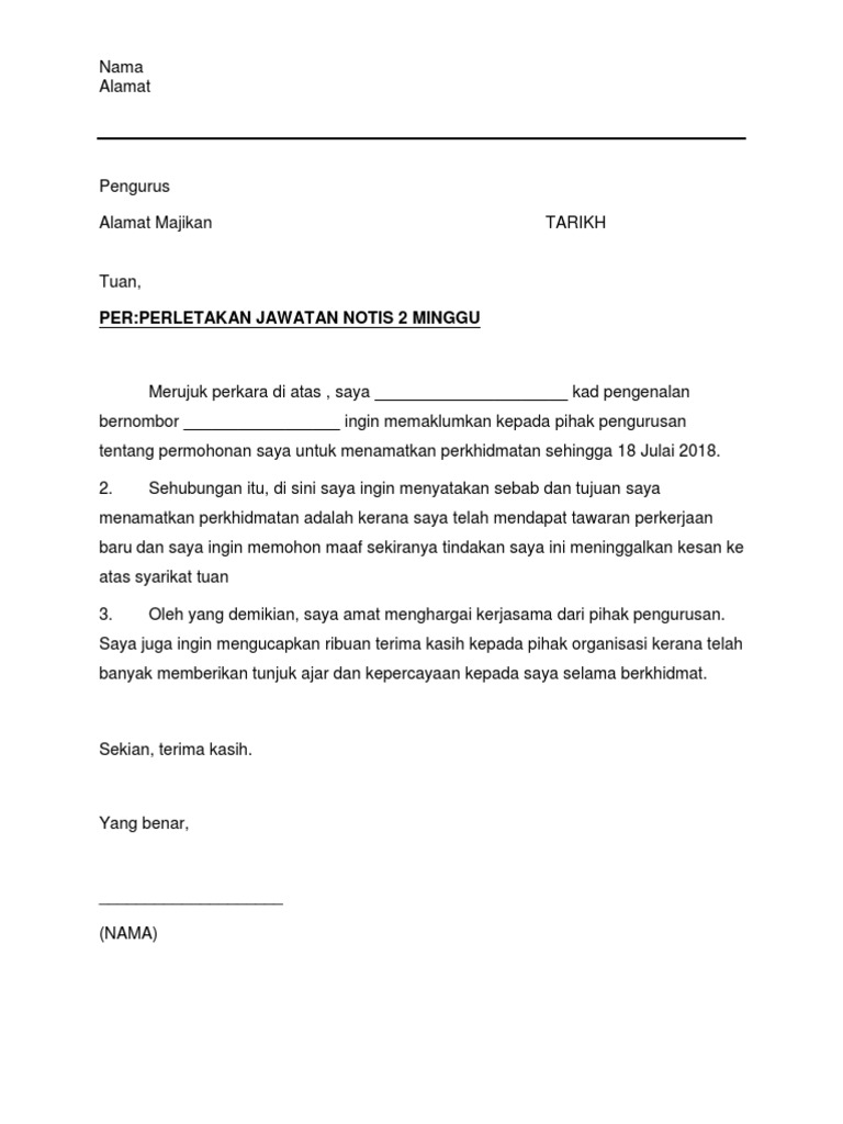 Berikut ialah contoh notis berhenti kerja kerana telah mendapat tawaran di tempat lain dengan notis 2 minggu iaitu 14 hari. Contoh cara nak tulis notis 24 jam 2 minggu sebulan 4 surat resign bahasa melayu yang lengkap maukerja kerja kosong malaysia senarai kerja kosong terkini 2019 di kuala lumpur selangor johor penang perak negeri negeri lain. Kebiasaannya notis 2 minggu ialah untuk pekerja yang masih lagi dalam probation. Berikut ialah contoh notis berhenti kerja kerana telah mendapat tawaran di tempat lain dengan notis 2 minggu iaitu 14 hari.