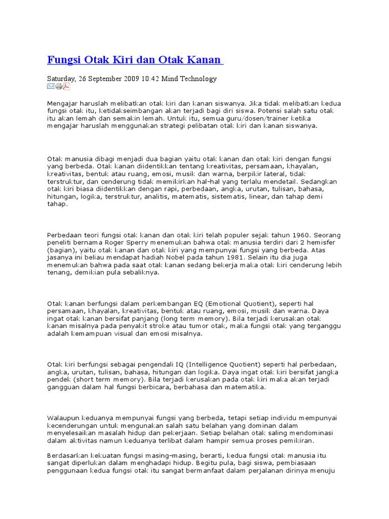 Perbedaan antara fungsi otak kanan dan otak kiri pertama kali dibuat sebagai upaya awal untuk mengidentifikasi penyebab masalah berbicara. Manusia merupakan mahluk yang mulia yang diberikan berbagai kelebihan oleh tuhan yang maha esa. Print friendly and pdf memang jika berhasil menyeimbangkan fungsi otak kanan dan kiri maka akan lebih mudah menangani permasalahan yang ada. Tingkat kinerja otak kiri dan otak kanan dengan pengategorian yaitu jika berada di antara satu sampai tiga termasuk rendah jika berada di antara empat sampai enam.