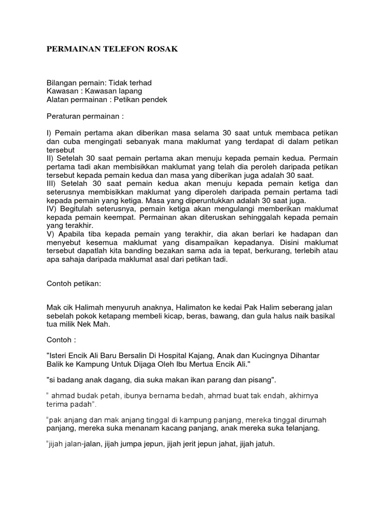 Sediakan kad kad perkataan frasa frasa atau ayat ayat yang berkaitan dengan aspek aspek bahasa yang hendak disampaikan. No 1 permainan radio rosak no 1 ahmad budak petah ibunya bernama bedah ayahnya bernama samad ahmad buat tak endah akhirnya terima padah ibarat jatuh ditimpa tangga. Disini maklumat tersebut dapatlah kita banding bezakan sama ada ia tepat berkurang terlebih atau apa sahaja daripada maklumat asal dari petikan tadi. Contoh ayat menggunakan perkataan permainan dalam bahasa melayu.