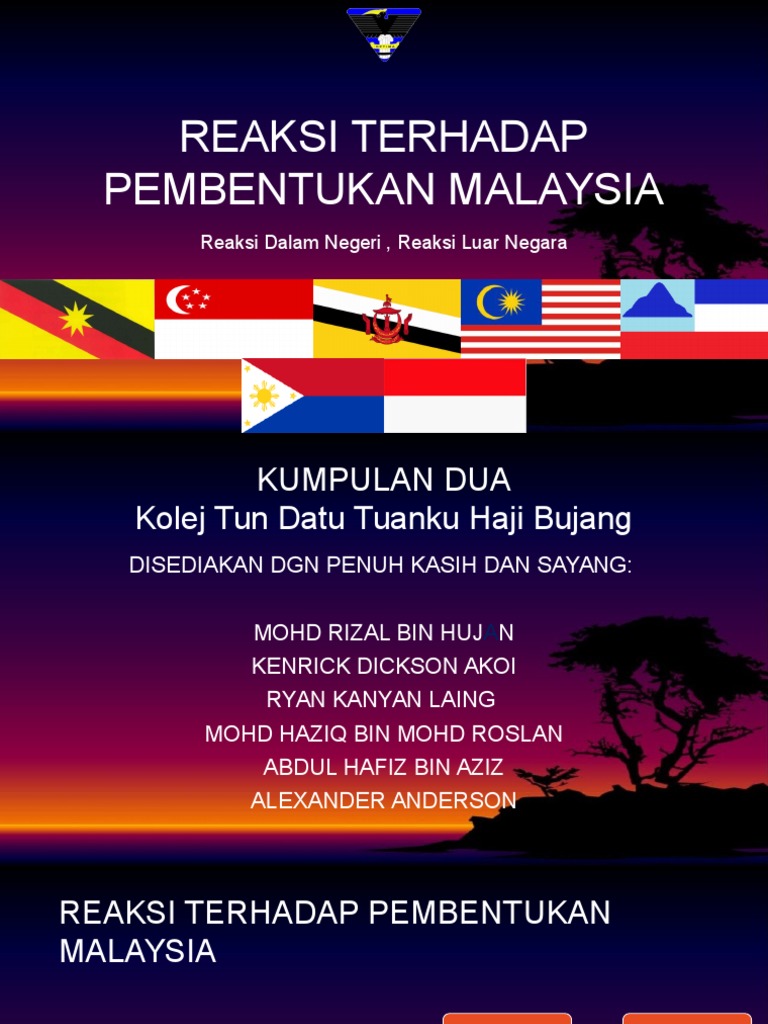 Reaksi terhadap pembentukan malaysia. Pada 11 februari 1963 dr. Pada peringkat awal ia dikenali sebagai tanah melayu atau malaya setelah mencapai kemerdekaan parti perikatan yang memerintah tanah melayu mendapati keadaan politik yang tidak tenteram di negara negara jiran boleh memberi kesan kepada kemerdekaan tanah melayu. C umno bersetuju tetapi menolak penyertaan singapura d pas dan barisan sosialis mencadangkan agar idea ini dirunding dahulu. Persekutuan tanah melayu a rakyat persekutuan tanah melayu menyambut baik cadangan pembentukan malaysia.