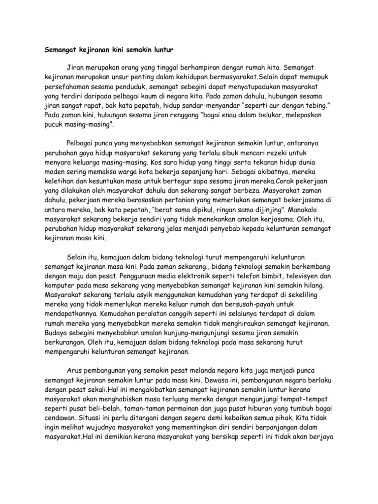Oleh itu kemajuan dalam bidang teknologi pada masa sekarang turut mempengaruhi kelunturan semangat kejiranan. Justeru senario ini haruslah disusuli dengan langkah yang efektif supaya dapat dibendung sebelum masalah seumpama ini terus menular menjadi barah yang akan menjejaskan keharmonian negara. Semangat kejiranan merujuk satu perasaan yang mengutamakan jiran tetangga dalam kehidupan seseorang itu. Akhir sekali semangat kejiranan yang semakin luntur tidak wajar dipandang enteng.