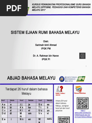 72 1 2 perkembangan sistem ejaan rumisebelum merdeka bab2 atas kebijaksanaan za ba mpsi telah memulakan sistemejaan baru yang dipanggil sistem ejaan sekolah atau dikenalijuga sebagai sistem ejaan za ba di antara buku buku yang ditulis oleh za ba ialah a ilmu bahasa melayu penggal 1926 b pelita bahasa melayu penggal 1941 c daftar ejaan melayu jawi rumi 1949 sistem ejaan. Sistem ejaan diajar agar murid dapat mengeja sesuatu perkataan dengan betul supaya makna perkataan bersamaan dengan maksud ujaran. Selain daripada senarai kosa kata pigafetta senarai perkataan bahasa melayu yang lain dalam tulisan rumi juga ditulis oleh cornelis de houtman dalam abad ke 16 iaitu pelayar belanda yang sampai di kepulauan melayu pada tahun 1596. Hingga ke sistem ejaan baru 1972 itu ejaan rumi kita telah berubah sebanyak.