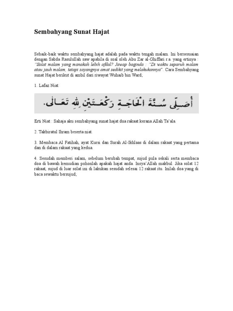 Solat ini dilakukan bagi mengharapkan pertolongan daripada allah s w t dalam meminta sesuatu yang dihajati atau menolak sesuatu yang tidak diingini. Untuk mengetahui bagaimana tata cara niat doa dan juga fadhilah sholat hajat simak penjelasan lengkap berikut ini. Solat sunat hajat 12 rakaat ni special sikit. Kaedah mendirikan solat hajat agar doa makbul dengan izin allah.
