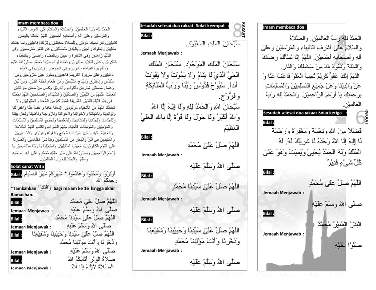 Bacaan surah solat tarawih 8 rakaat. Hiasilah malam malam pada bulan ramadan ini dengan ibadat solat sunat tarawih sunat witir tadarus al quran berzikir dan lain lain amal kebajikan. Jumlah ini dipilih oleh kebanyakan umat islam malaysia. Solat tarawih hanya boleh dilakukan pada bulan ramadan sahaja.