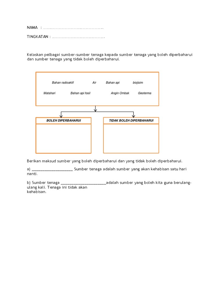 Sumber tenaga yang tidak boleh diperbaharui non renewable energy sources merupakan tenaga yang tidak boleh ditambah digantikan atau diperbaharui ianya terhad dan akan kehabisan pada masa akan datang contoh contoh sumber tenaga yang tidak boleh diperbaharui adalah seperti. Kebanyakan sumber sumber tenaga yang boleh diperbaharui ini digunakan untuk menghasilkan arus elektrik. Sumber boleh diperbaharui sebahagian daripada persekitaran semula jadi bumi dan komponen terbesar ekosferanya.