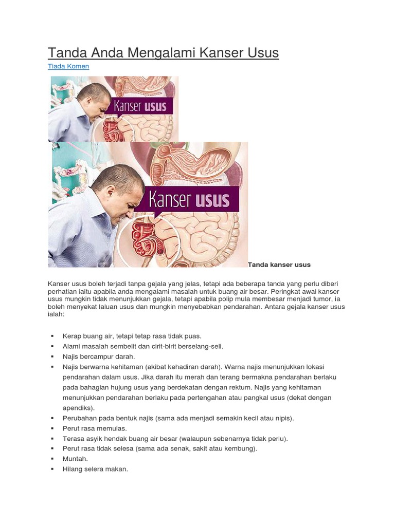 Peringkat awal kanser usus mungkin tidak menunjukkan gejala tetapi apabila polip mula membesar menjadi tumor ia boleh menyekat laluan usus dan mungkin menyebabkan pendarahan. Mungkin tak ramai yang perasan tanda ini berikut adalah 8 tanda kanser usus yang perlu diambil perhatian. Antara tanda awal kanser hati mungkin juga leukimia kerana pada ketika ini limpa sedang membesar lalu menekan bawah perut disebelah kiri. 12 tanda kanser usus kepada orang ramai.
