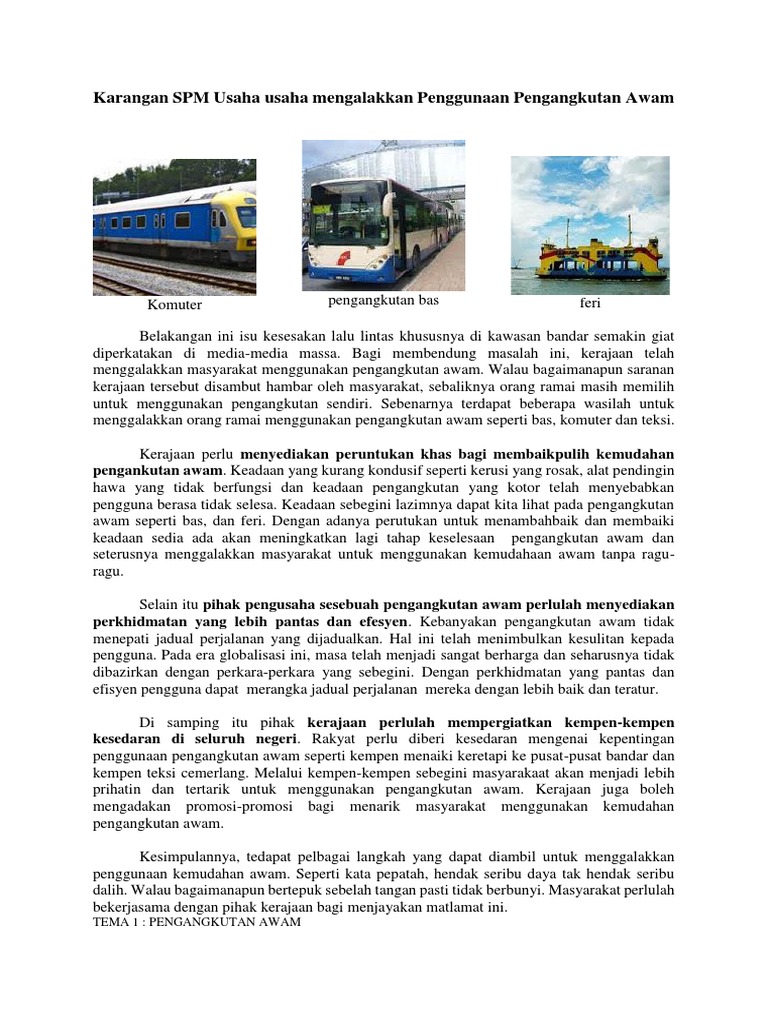 Jika diperhalusi ada berbagai bagai faedah yang kita peroleh apabila menggunakan pengangkutan awam. Perkhidmatan awam kini adalah lebih baik jika hendak dibandingkan satu dekad yang lalu. Penulisan karangan bahasa melayu terdiri daripada variasi tema yang akan menguji pengetahuan dan penguasaan bahasa para pelajar. Pengguna pengangkutan awam juga tidak perlu memikirkan kos perkhidmatan meletakkan kenderaan.